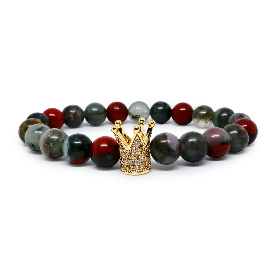 - A Royal African Bloodstone Bracelet with 18k Gold Plated CZ Crown for Unisex.