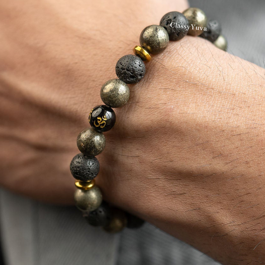 Introducing our "Pyrite, Onyx Om, and Lava Trio Bracelet" – a captivating fusion of earth's...