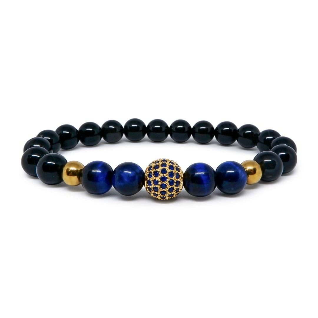 Royal Blue Tiger Eye Bracelet with Black Agate & CZ Crown/Ball