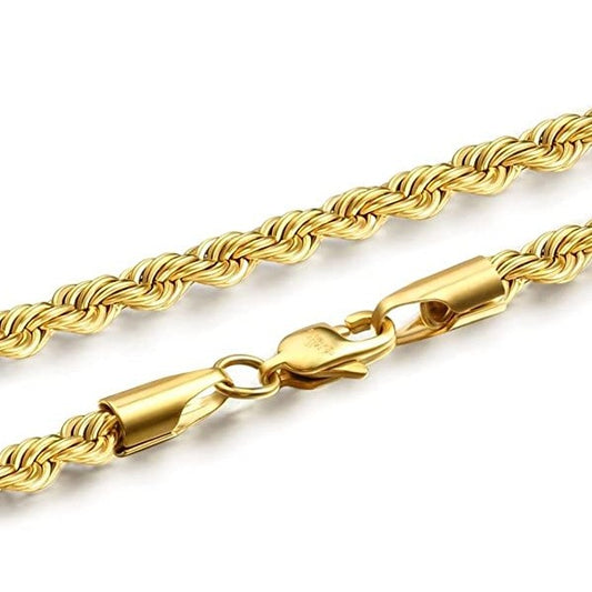 Charming Italian Stainless Steel 22k Micro Gold Plated Rope Shape 4mm Chain for Unisex. Plated...