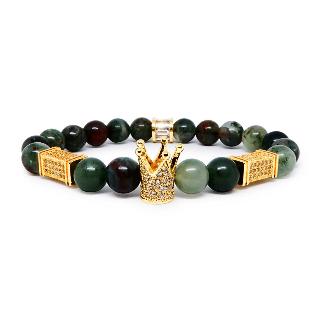 - A Royal African Bloodstone Bracelet with 18k Gold Plated CZ Crown for Unisex.