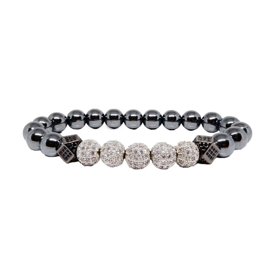 - A Royal Hematite Bracelet with Platinum Plated CZ Charms for Unisex.
