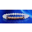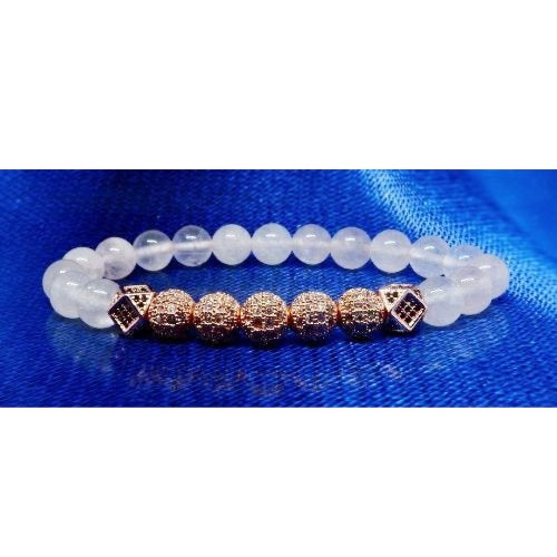 - A Royal Rose Quartz Bracelet with 22k Rose Gold Plated CZ Charms for Unisex.