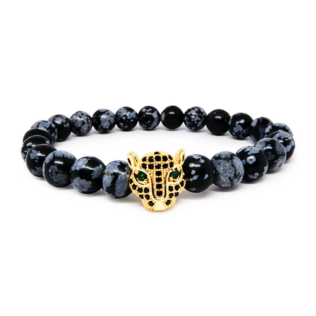 Royal Snowflake Obsidian Bracelet with 22k Gold Plated CZ Leopard Head/Cube
